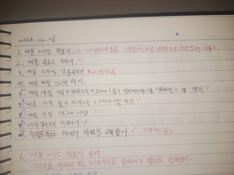 내가 적은 2월 6일에 할 일들 이였다. 이걸 다 했을까? 아니다~! 그전에 뭘 해야 한다고 했는지 볼까? 참 못났다, 기상시간과 물 마시는 거 비타민 먹는 거 적었다. 하지만 난 창피하지 않다. 대다수의 사람들이 거창한 거 써놓고 안 지키는 것보다 이런 것부터 지켜나가는 내가 더 낮다고 생각하니까.